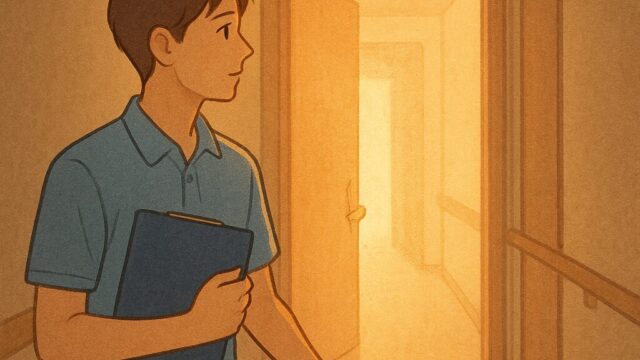 介護士の気持ち ノックの向こう側で、介護職はいつも考えている 2025年12月16日 空 そらの部屋 居室の前で一度立ち止まる。 ノックする前の、ほんの数秒。 その短い時間に、介護職はいろんなことを考えている。 ―― ノックする前の間(ま) 居室 …